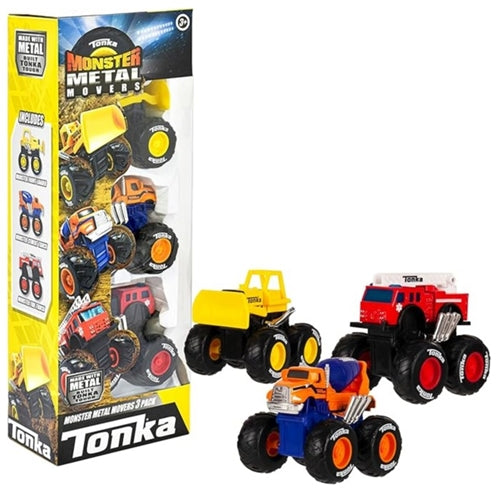 - 3 MONSTER TRUCKS! This Tonka Monster Metal Movers three-pack includes a Front Loader to rule your construction zone, a Fire Truck to handle any emergency in town, and a Cement Mixer to serve your city. Explore the Front Loader's movable blade, adjust the Fire Truck's moveable ladder, and spin the Cement Mixer's rotatable drum for ultimate imaginative fun!