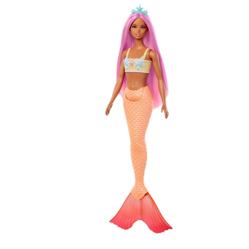 - Barbe mermaid doll wears a stunning shell bodice and has a curvy body type, as well as a tropical red tail with an ombre fin!