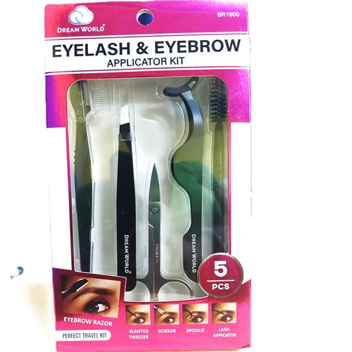 Dream World Travel Eyelash & Eyebrow Applicator Kit 5 Pcs Pack is made with high quality stainless steel material. This kit comes with a eyebrow razor, slanted tweezer, scissor, spoolie, and lash appicatorย