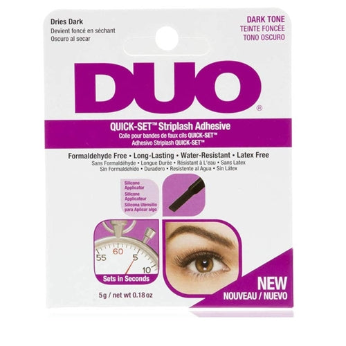 - Sets False Lashes In Seconds: No more waiting game! DUO Quick-Set Adhesive Dark is a fast drying eyelash glue with extremely smooth and fluid consistency. Dries dark and blends well with your falsies completing your alluring eye makeup while giving your faux lash a more natural look.