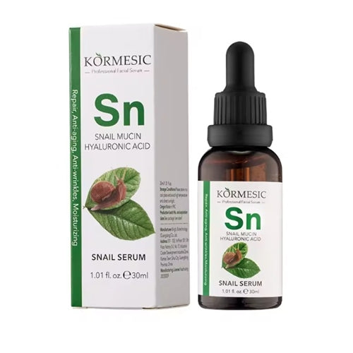 The Kormesic Snail Mucin Hyaluronic Acid Essence 30ml is a hydrating K-beauty serum that combines snail secretion filtrate (mucin) with hyaluronic acid to moisturize, repair, and improve skin elasticity, offering benefits like anti-aging, soothing, and pore reduction.